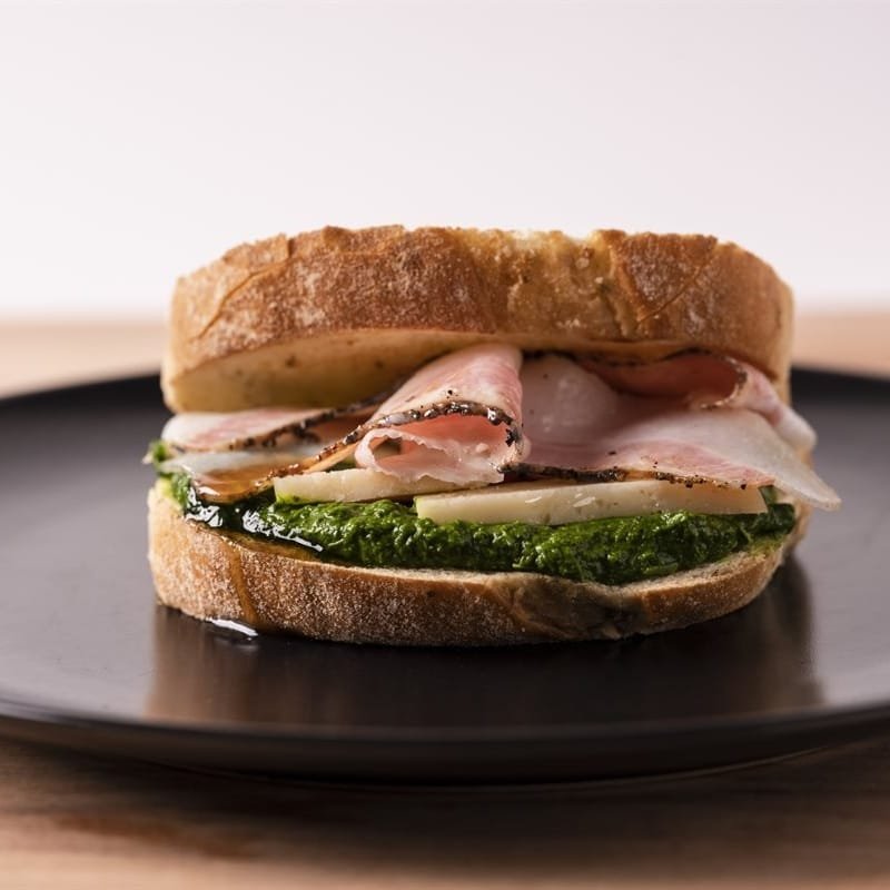 Sandwich with turnip greens, honey and pepper guanciale