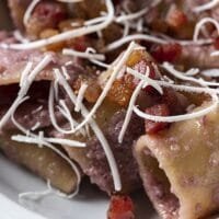 Mezzi paccheri pasta with radicchio pesto and pepper guanciale