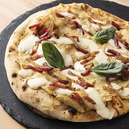 Pizza with chickpea cream, fior di latte cheese and pepper guanciale